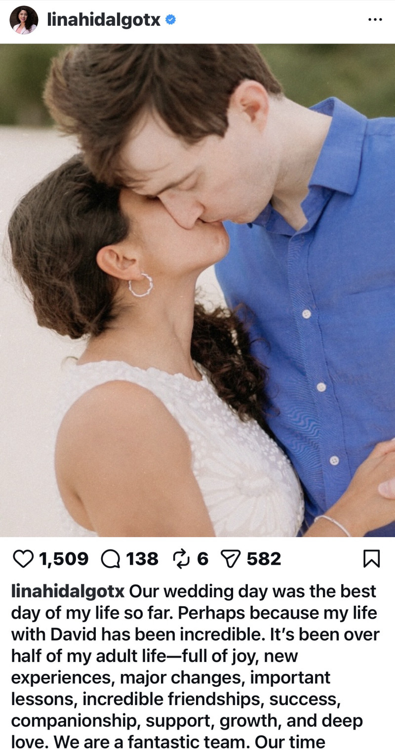 ——婚後一年突生變故,政壇焦點人物引發輿論關注【美南新聞泉深】休斯敦訊——哈裏斯郡郡長、德州政壇矚目的民主黨人物琳娜·希達爾戈(Lina Hidalgo)于12月1日(周一)通過社交媒體正式宣布,她與丈夫大衛·詹姆斯(David James)已決定分居。這一消息震動休斯敦政治圈,也引發廣泛公衆討論。這對夫妻于去年公布訂婚並迅速在奧斯汀成婚,婚禮故事後來被《Vogue》雜志專題報道,成爲當時政界與媒體口中的浪漫佳話。然而,僅一年之後,二人關系卻畫下暫停符。