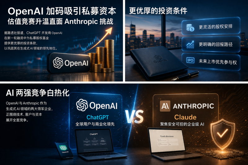 【美南新聞泉深】在全球人工智能競賽不斷升級之際,ChatGPT開發商OpenAI正通過更加優厚的投資條款,積極吸引大型私募股權基金入局,以鞏固其在生成式AI領域的領先地位。根據路透社最新報道,OpenAI在最新一輪融資談判中向私募投資者提供了較競爭對手Anthropic更具吸引力的條件,顯示出其在資本市場上的主動出擊與戰略野心。投資條件升級  OpenAI主動出擊資本市場知情人士透露,OpenAI此次向潛在私募投資者提出的條件包括更具靈活性的股權安排、更明確的回報路徑,以及在未來可能上市(IPO)中的優先參與權。這些條款顯著提升了投資吸引力,使私募基金能夠在AI行業高速增長階段獲得更穩健的回報預期。相比之下,競爭對手Anthropic雖然同樣獲得包括大型科技公司在內的資金支持,但在部分投資條款設計上更爲謹慎,強