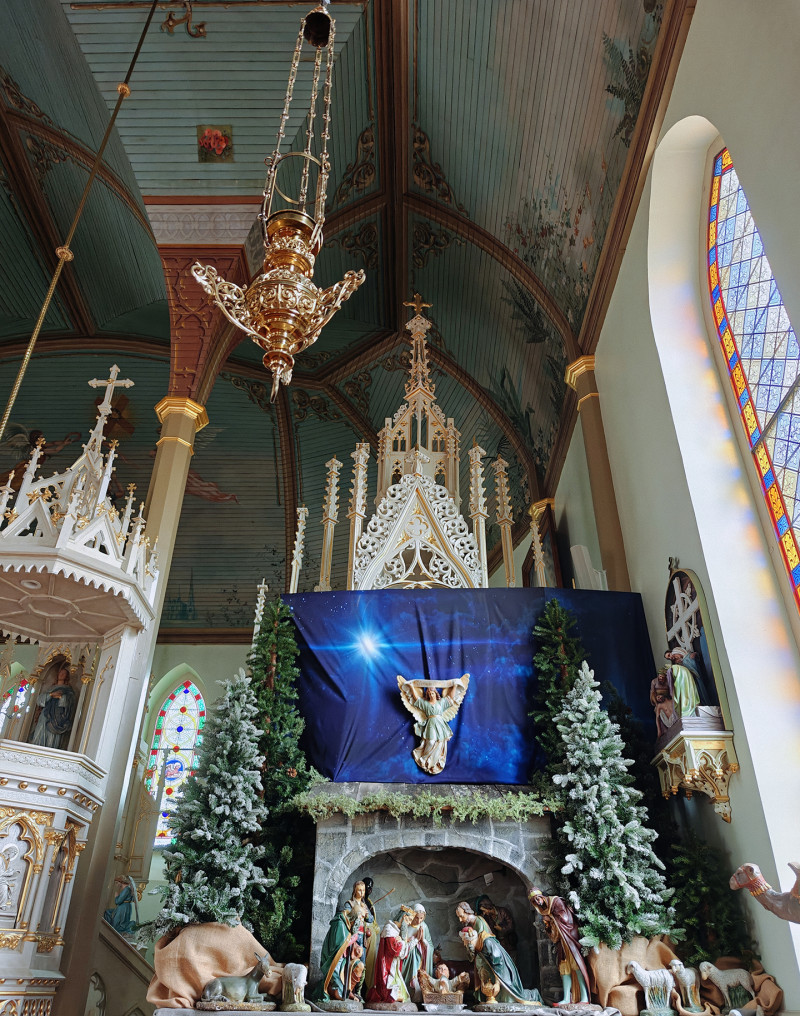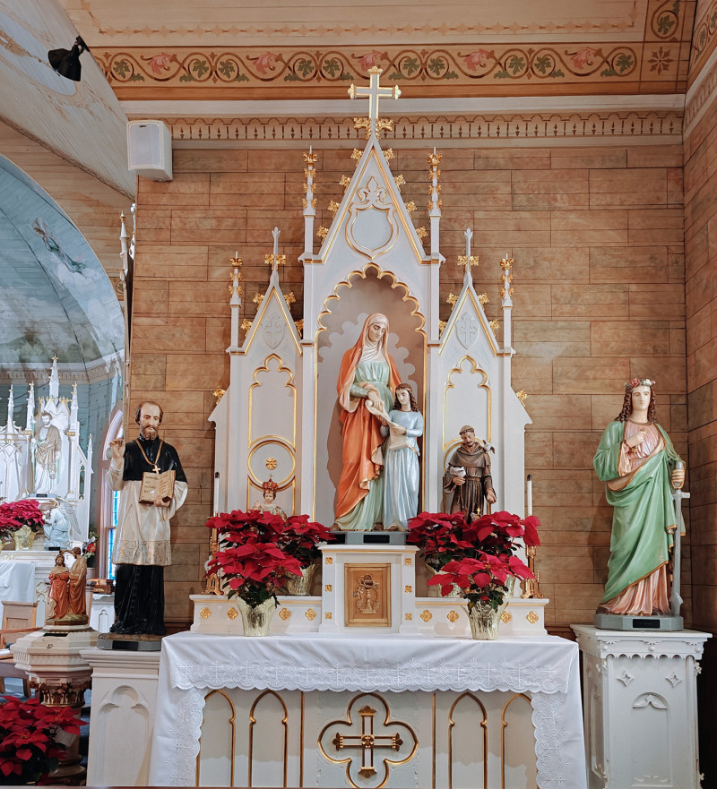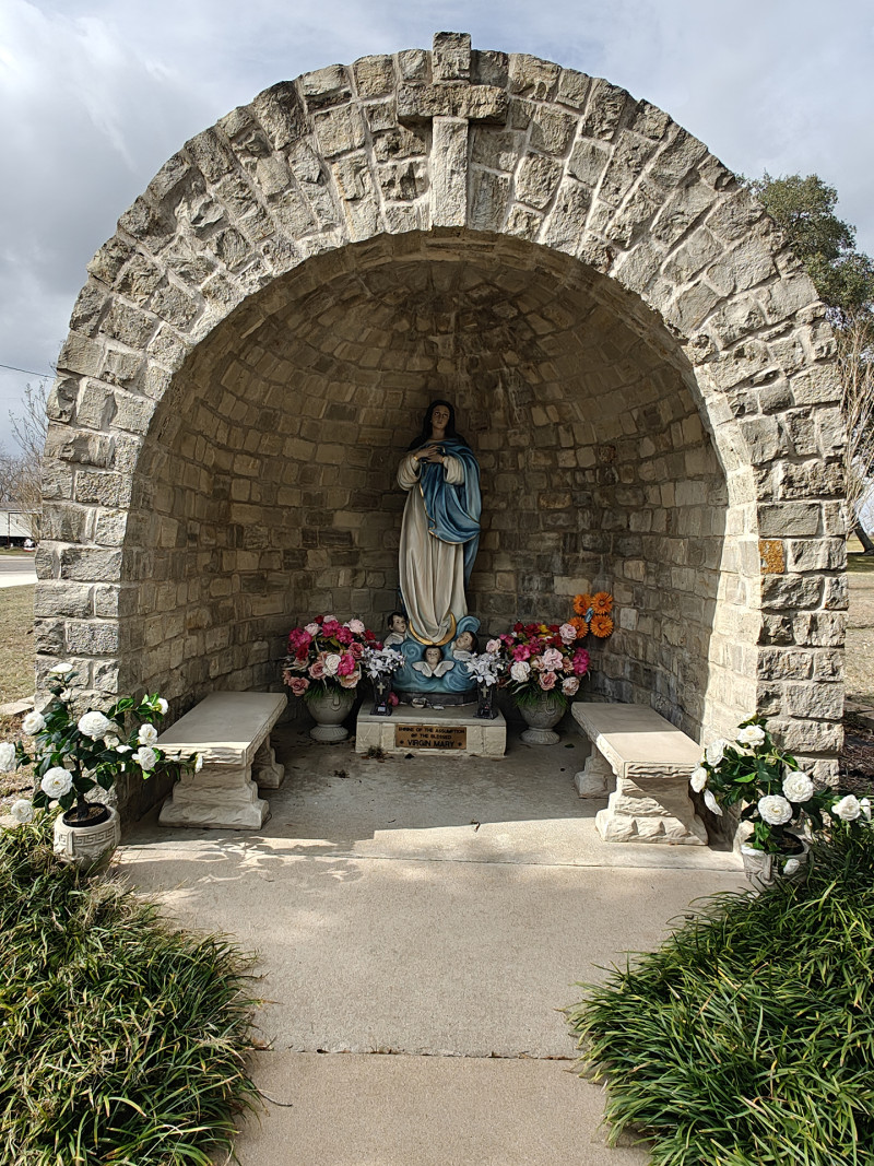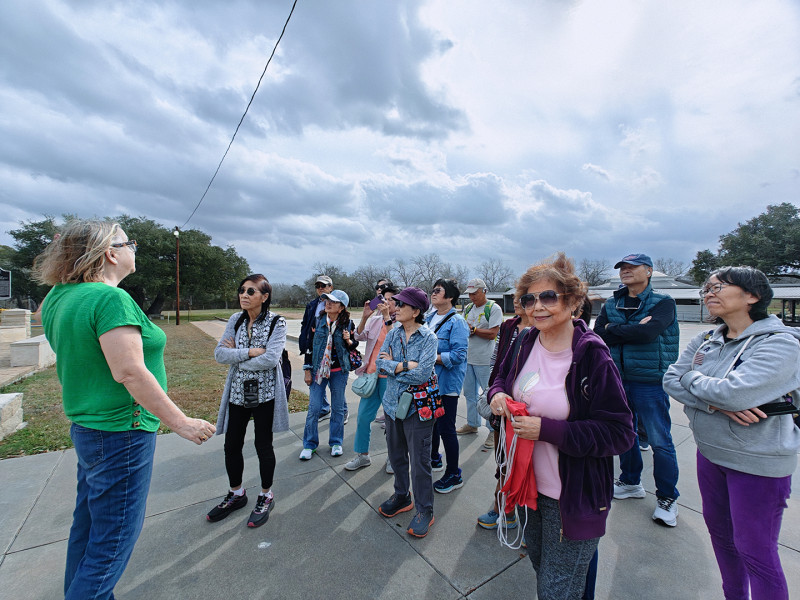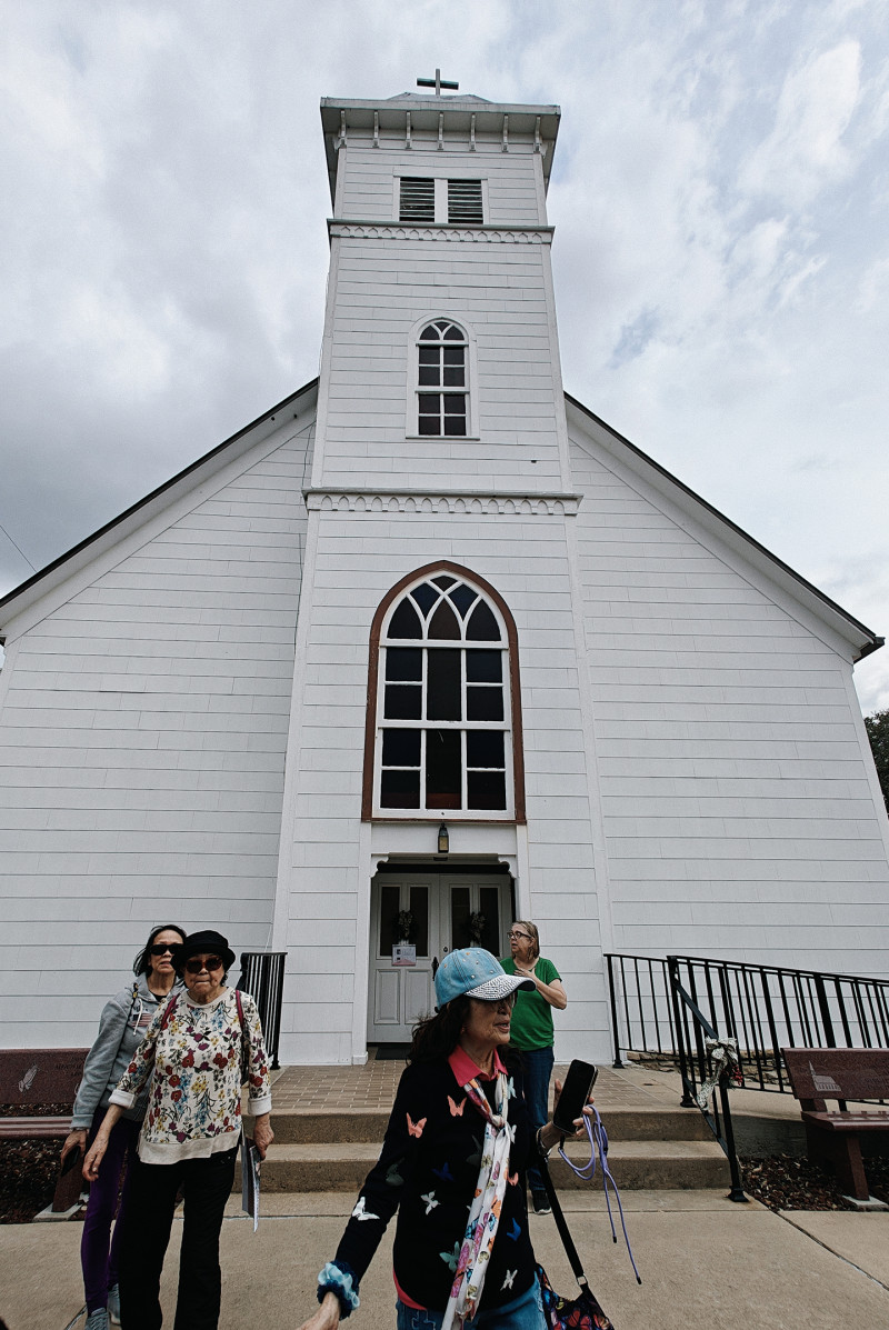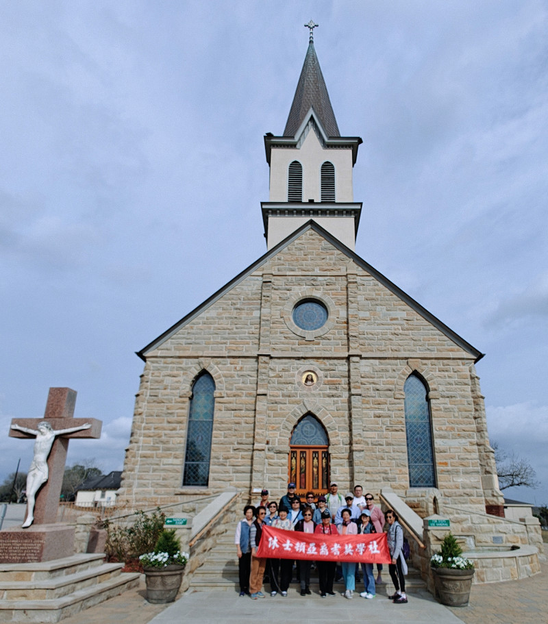 彩繪教堂Painted Churches of Texas是指一系列由中歐移民 ,捷克人、德國人、波希米亜人等, 在 19–20 世纪期間於德州鄉村建造的,以精美壁畫與花飾圖案,鲜明的室内装饰、 彩繪、模板繪圖 (stenciling)、仿大理石(marbling)、彩色窗户等著稱的教堂。這些充滿歐洲風格與中歐傳统,並融合德州鄉村现况的彩繪教堂,有著獨特的文化風貌,成為了德州中歐移民歷史的一種视覺象徵。今第三度重遊,周宏會長行前仍親自電話Schulenburg Chamber of Commerce Tourism Center安排了付費導覽,參觀了另外三個分別具有19世纪捷克或德國移民特色的彩繪教堂。大巴先到商務部付費和接導遊GiGi女士。上次的導遊Natlie是當地捷克移民後裔,GiGi則是明尼蘇答大學畢業後才來到此地的。我們參觀的第一座彩繪教堂是,位於 Fayette 郡附近 Praha 社區的聖母升天聖瑪麗教堂(St. Mary’s Church of the Assumption)。聖母升天聖瑪麗教堂(St. Mary’s Church of the Assumption)建成於1895 年,是哥徳復興式(Gothic Revival)風格的 石结構(牛車運來的