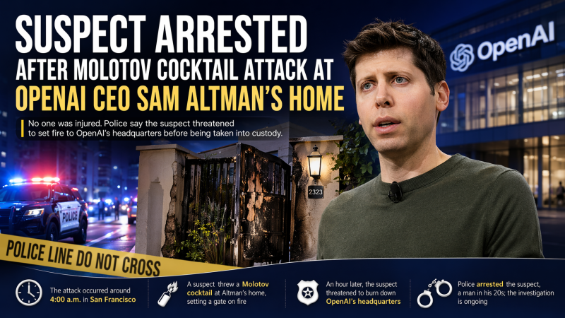 • OpenAI首席執行官奧爾特曼住所遭燃燒瓶襲擊 嫌疑人被捕無人員傷亡
