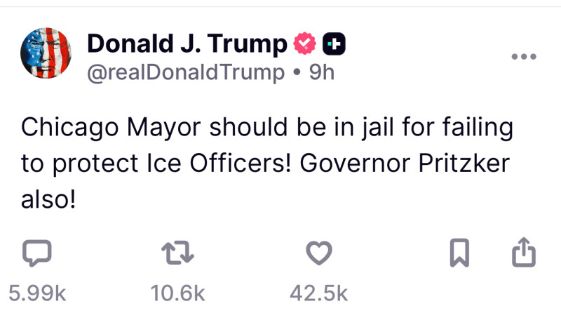 特朗普當日在其社交平台發文,指責芝加哥與伊州當局“未能保護正在芝加哥執法的移民與海關執法局(ICE)人員”。他寫道:“芝加哥市長因未能保護ICE人員,應該進監獄!州長普裏茨克也一樣!”