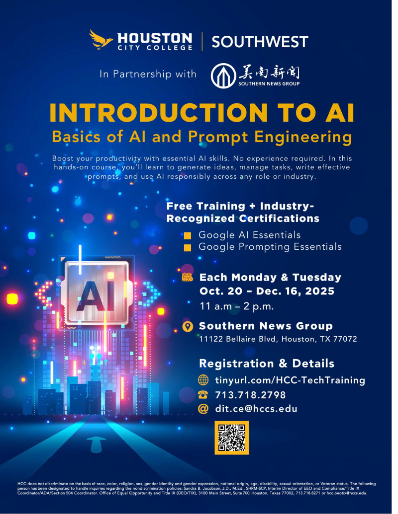 (美南新聞韋霓報導)在人工智能(AI)迅速席捲各行各業的今天,懂得如何與 AI 共舞,已成為職場與生活的一項核心能力。現在,一個由休斯頓城市學院系統Houston City College(簡稱HCC) 與美南集團共同推出的免費課程正等著你來報名,這不是普通的講座,而是一場實作導向、貼近業界的 AI 入門訓練。無論你是科技新手,還是希望在工作中融入 AI 工具的專業人員,都能在這堂課中找到助力。