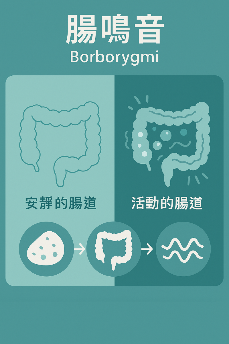 腸鳴音突然變得非常大聲、頻繁、伴隨腹痛、腹瀉。