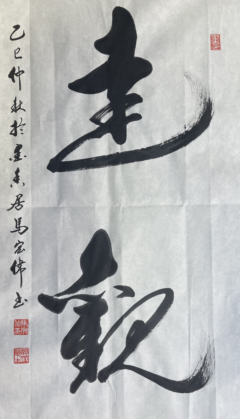 啓骧先生曾親筆題贈“通靈”二字,以嘉其悟性與才氣。馬宏偉銘記恩師教誨——“學書在法,其妙在人,有法無法,無法有法”,並以“剛柔並濟、融會貫通、形神兼備”爲終身追求。他常說:“書法是文化的見證,寫字更是修心的過程。”