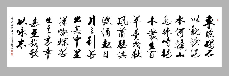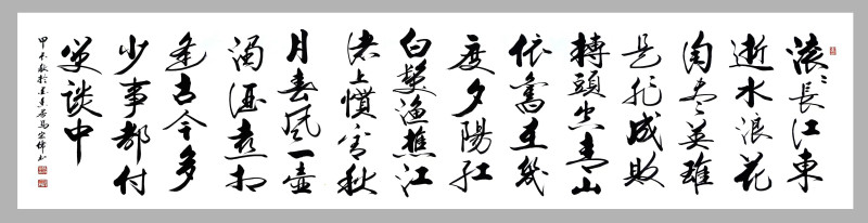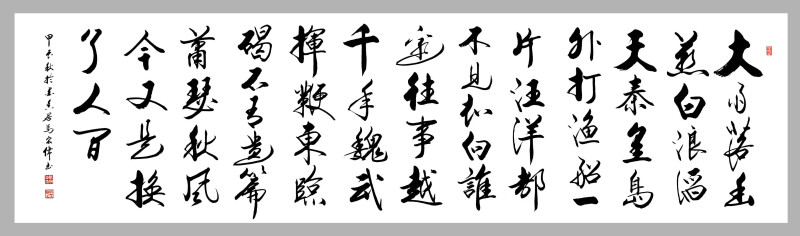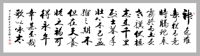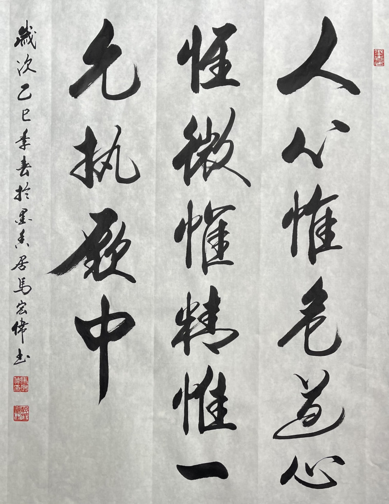 馬宏偉的書法,線條遒勁,筆勢縱橫,氣韻生動。提按頓挫之間,筆鋒如龍蛇翻舞,點畫若墜石擊玉;運筆流暢處,又似行雲流水、氣脈貫通。他的作品既有法度之嚴謹與沉雄,又兼靈氣之灑脫與飄逸——古樸中見華美,清新中見力度。