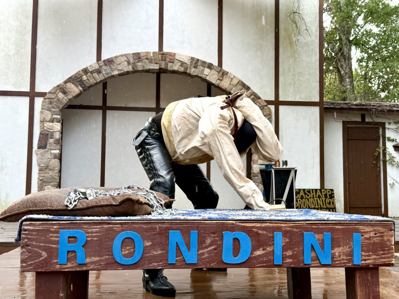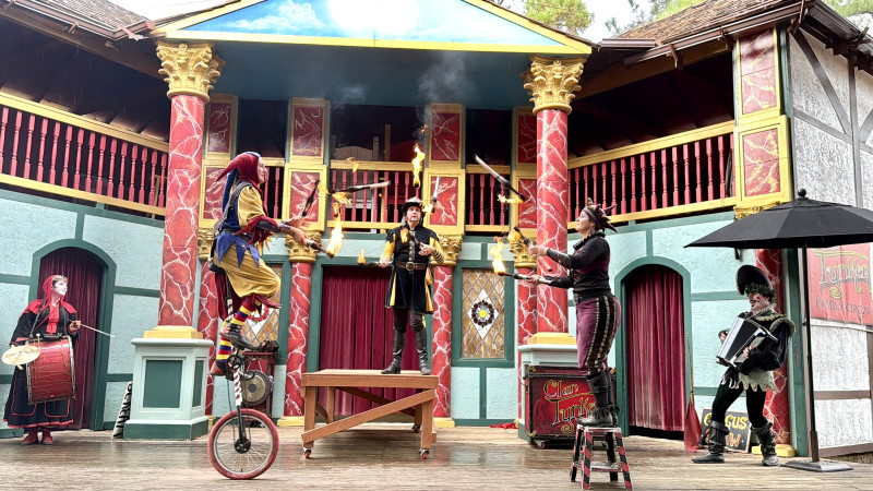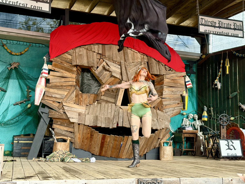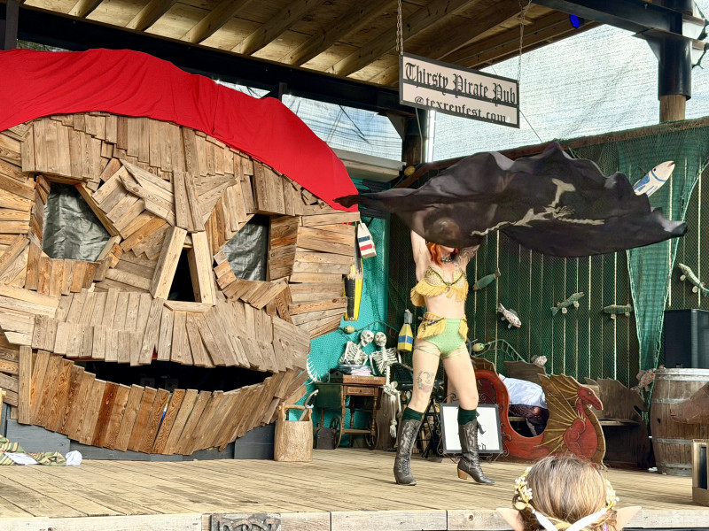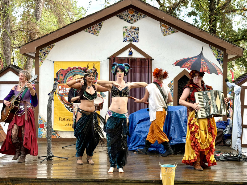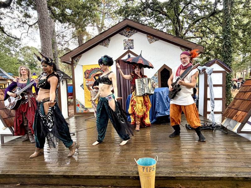 德克薩斯文藝複興節不僅是穿越時光的盛會,更是文化與藝術的多重交響。在雨後的松林舞台上,Carnivale Show 以異域旋律與熱情舞步點燃觀衆的心。吉他、手風琴與鼓聲交織成一曲融合世界民樂的節奏,舞者身著綠藍紗裙,在火焰般的燈光中旋轉、飛舞,腰鈴與腳步一同奏響生命的樂章。