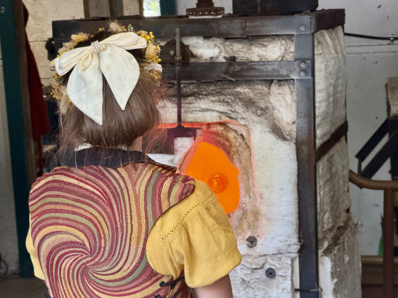 在工藝區,火光閃爍,一位年輕的女工匠頭戴花環、手持吹管,將千度高溫的玻璃吹成晶瑩的藝術。