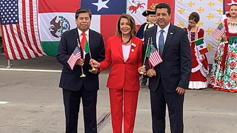 活動當天,美國與墨西哥國旗並列高懸,佩洛西身著鮮紅套裝,雙手持墨西哥國旗幟,與地方政要共同參加慶典,呼籲在移民與貿易議題上尋求平衡與合作。