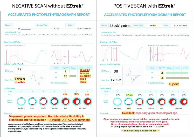 而放射科醫師 Robert Kagan 更驚訝地指出:有病人原本服用傳統降脂藥物,但血管影像改善有限;加入EZTrek 營養油後動脈影像明顯改善,停用後又再度惡化。