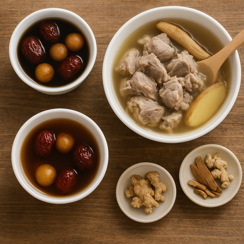 日常可以用這些食材煮湯、煮茶或煲粥,例如:當歸生薑羊肉湯、桂圓紅棗茶、黃耆枸杞雞湯