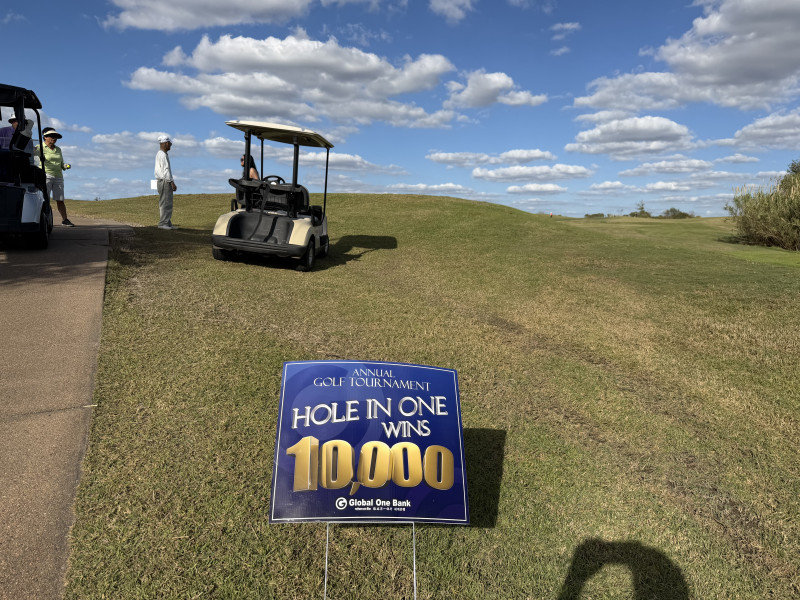 本届赛事最引人瞩目的特别奖项之一,是由环球第一银行设立的 “一杆进洞(Hole in One)赢取 $10,000 美元大奖”。奖牌醒目地立在指定球洞前,吸引了所有参赛者的关注,也成为全场最具挑战性的高额奖项。