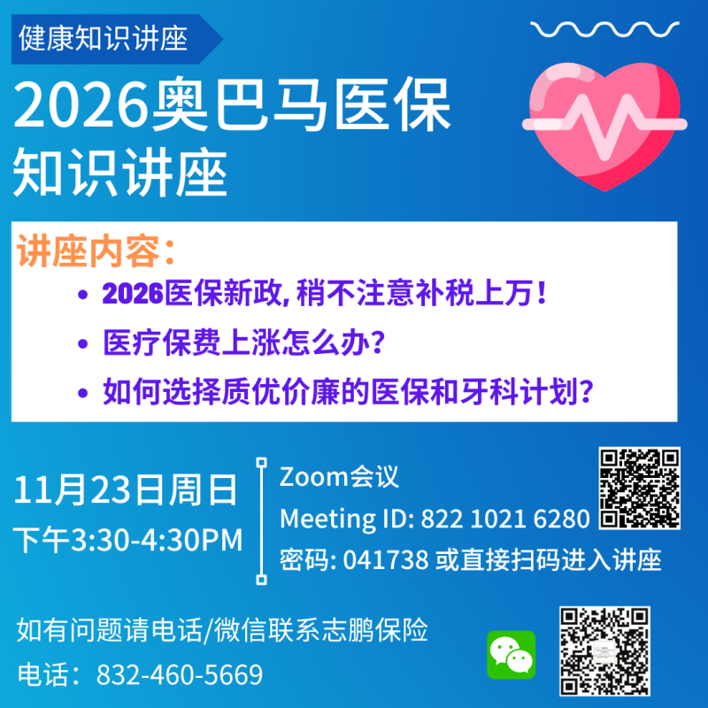 對於語言不熟悉、醫保規則複雜而感到困惑的華裔家庭來說,今年的醫保選擇期更是必須謹慎面對。為了協助大家掌握資訊、避免誤踩陷阱,志鵬保險特別舉辦「2026奧巴馬醫保線上講座」,以深入淺出、清晰明瞭的方式,替民眾解析政策新變化,並手把手教你如何做出正確選擇。