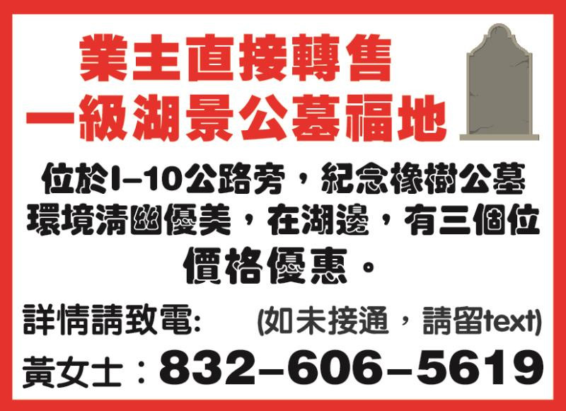 詳情請致電: 黃女士832-606-5619 (如未接通,請留text)
