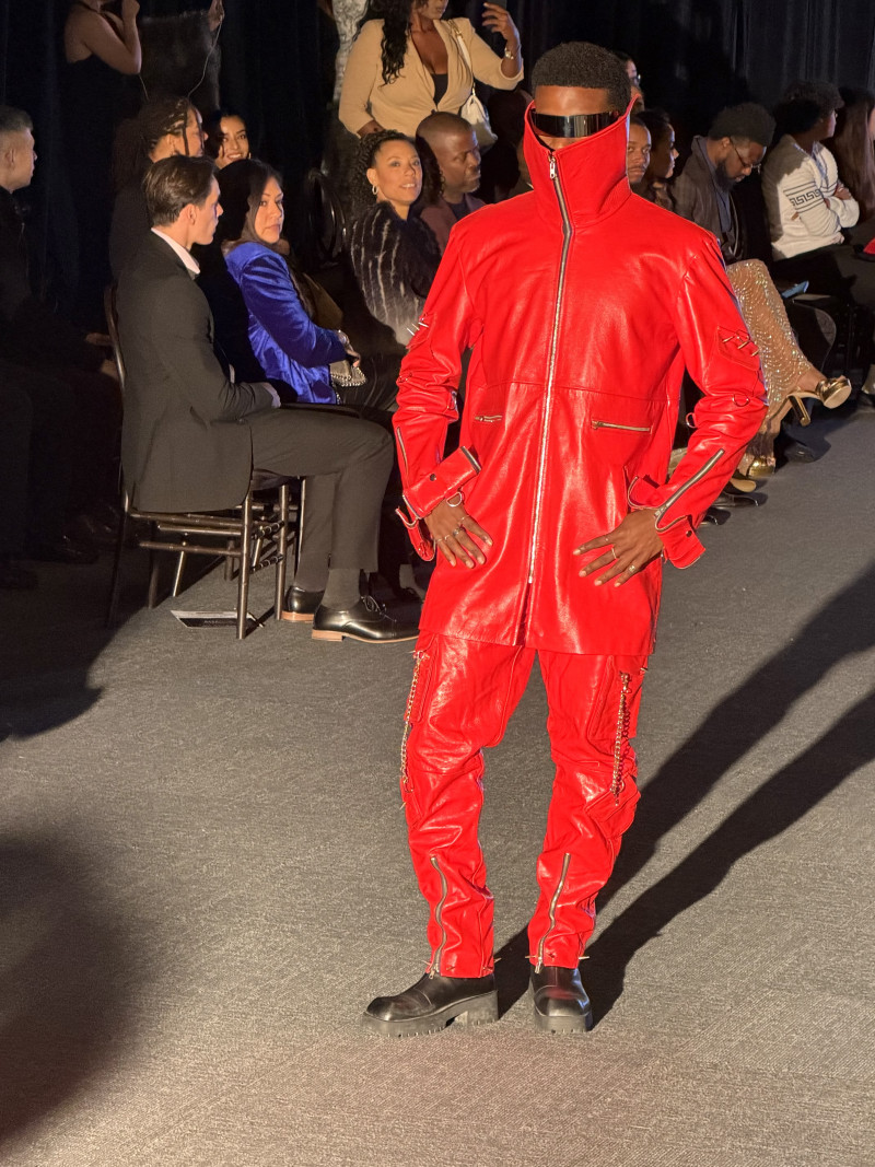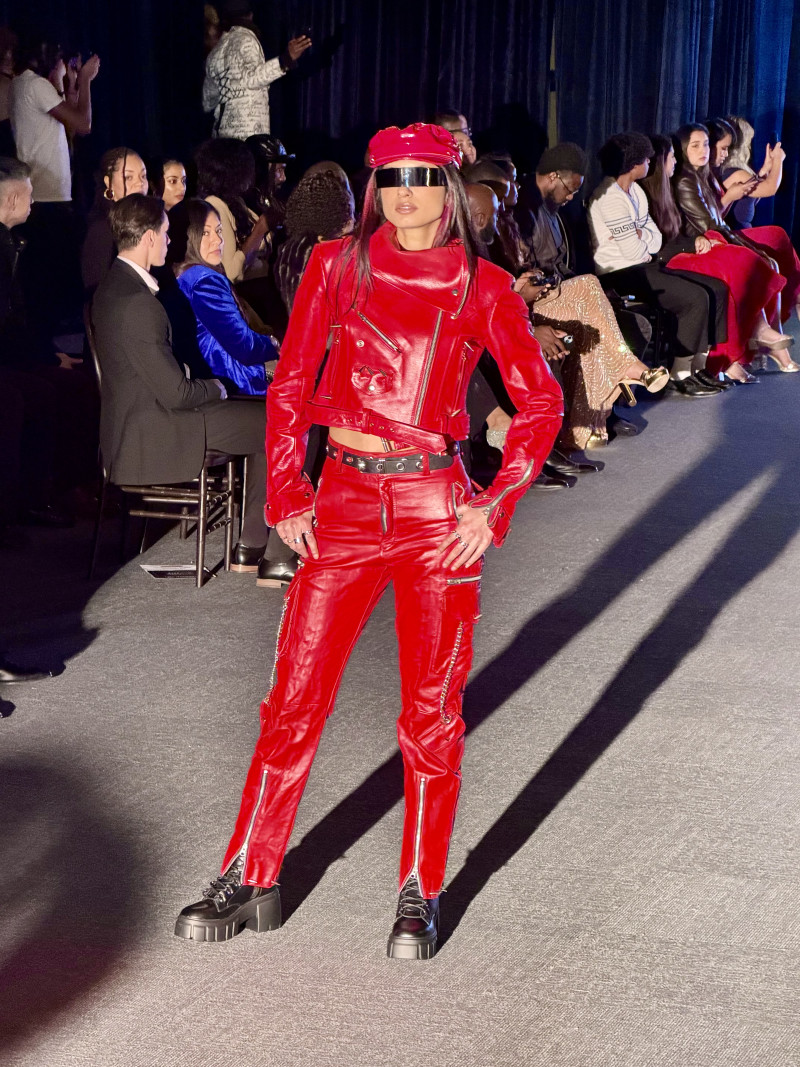 大膽的交叉綁帶、镂空設計與星塵般的布料,讓紅色連體裝模特成爲全場焦點。
