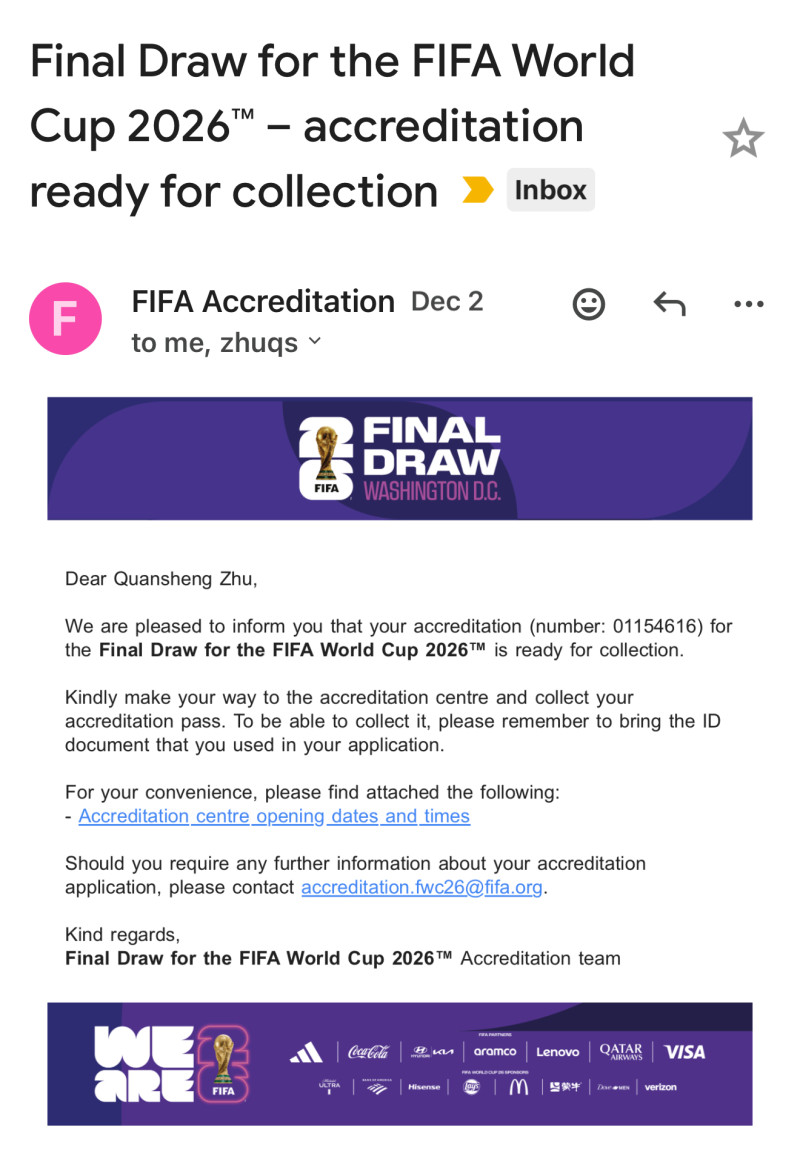 Your accreditation (number: 01154616) for the Final Draw for the FIFA World Cup 2026™ is ready for collection…”由于朱全勝博士將在同一時間乘機前往中國執行文化交流活動,最終無法親臨華盛頓參與此次全球矚目的盛典。