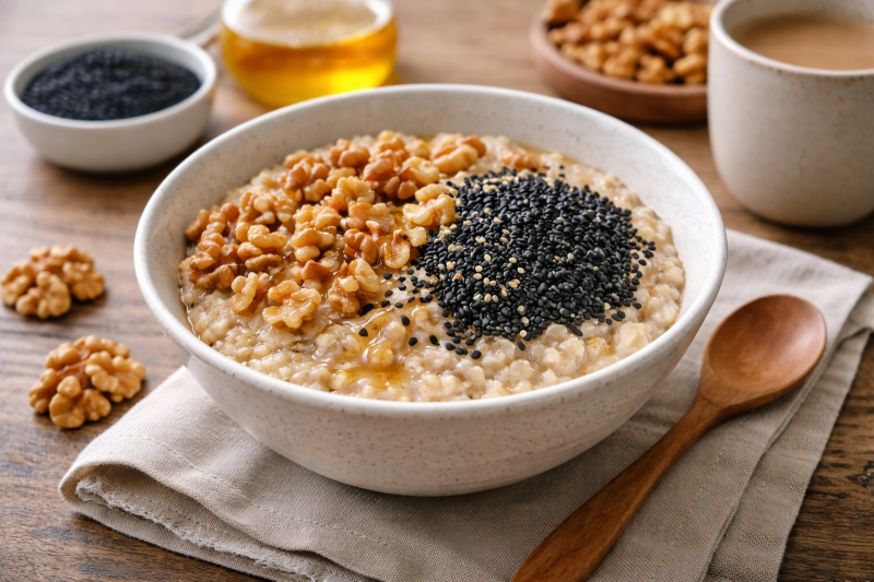 早晨可選擇燕麥加核桃與黑芝麻。這組合在中醫中有「補腎益精」之意,現代營養學則指出,其富含Omega-3脂肪酸、鎂與膳食纖維,有助於腦部與心血管健康。