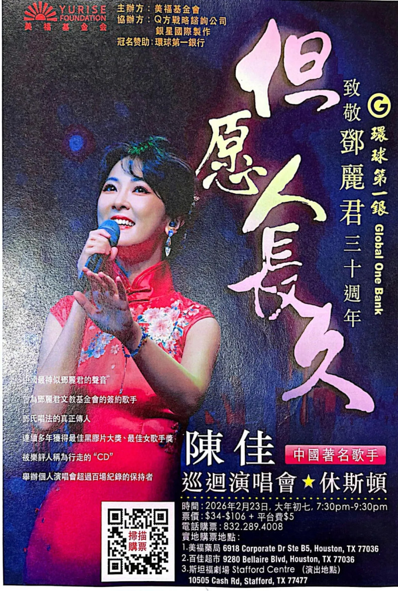 2026年正值鄧麗君逝世三十週年。被華語音樂界及鄧麗君家人一致譽為“鄧麗君最佳傳承人”的著名歌手陳佳,其《但願人長久》全球巡迴演唱會——休斯頓站,將於2026年2月23日(大年初七,星期一)晚上7:30–9:30,在 Stafford Centre(斯坦福劇院) 隆重舉行。