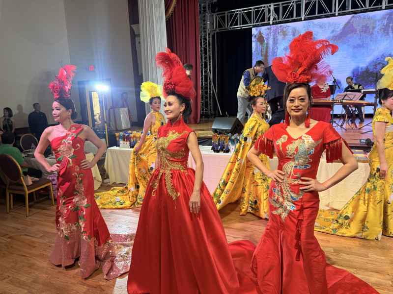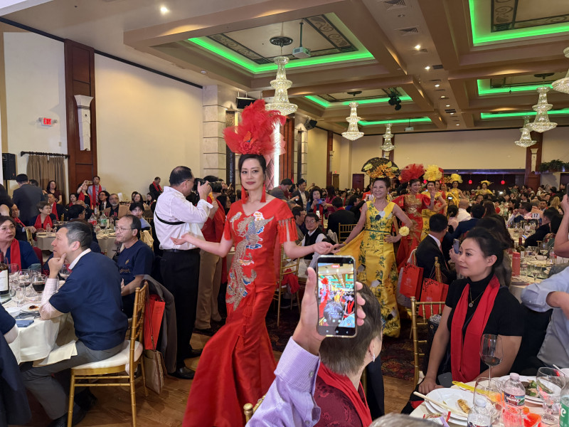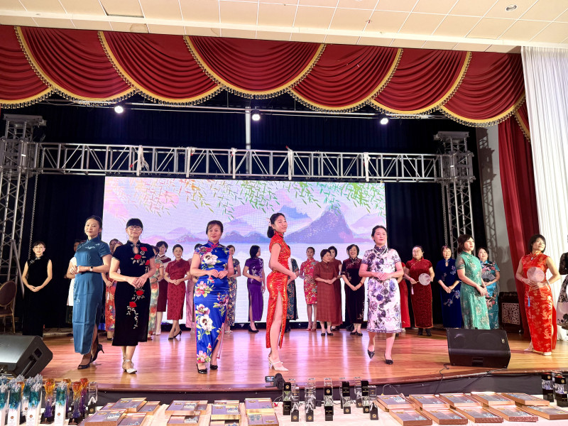 與傳統舞台表演不同,本場慶典特別設計了延伸至宴會區的走秀環節。模特身著旗袍與中式禮服,緩緩從嘉賓席走上舞台,紅、金、黃等色彩交相輝映,刺繡與剪裁兼具傳統與現代美感。