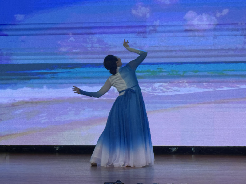 在音樂之後登場的,是多組中國舞與群舞作品。舞者身著漸變藍、白、粉色長裙,舞姿舒展流暢,背景屏幕呈現海浪、天際、雲霞與遠方的意象。