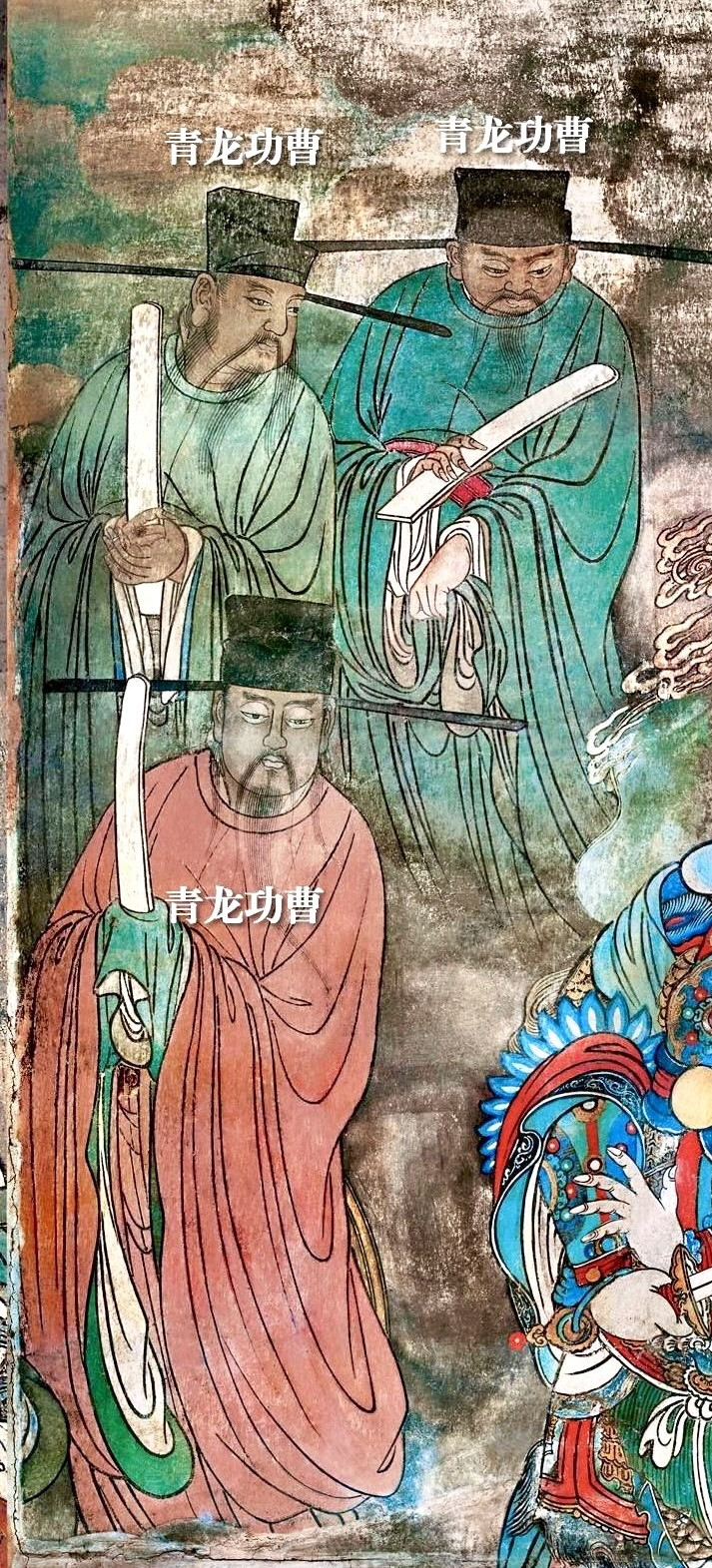 與此同時,青龍功曹在張大千筆下的服飾處理,也顯著不同于永樂宮原作,其色彩飽和度提高,並融入金黃、赭黃等暖色成分。這種變化並非單純的裝飾強化,而更可能反映了神職系統內部等級關系的調整。