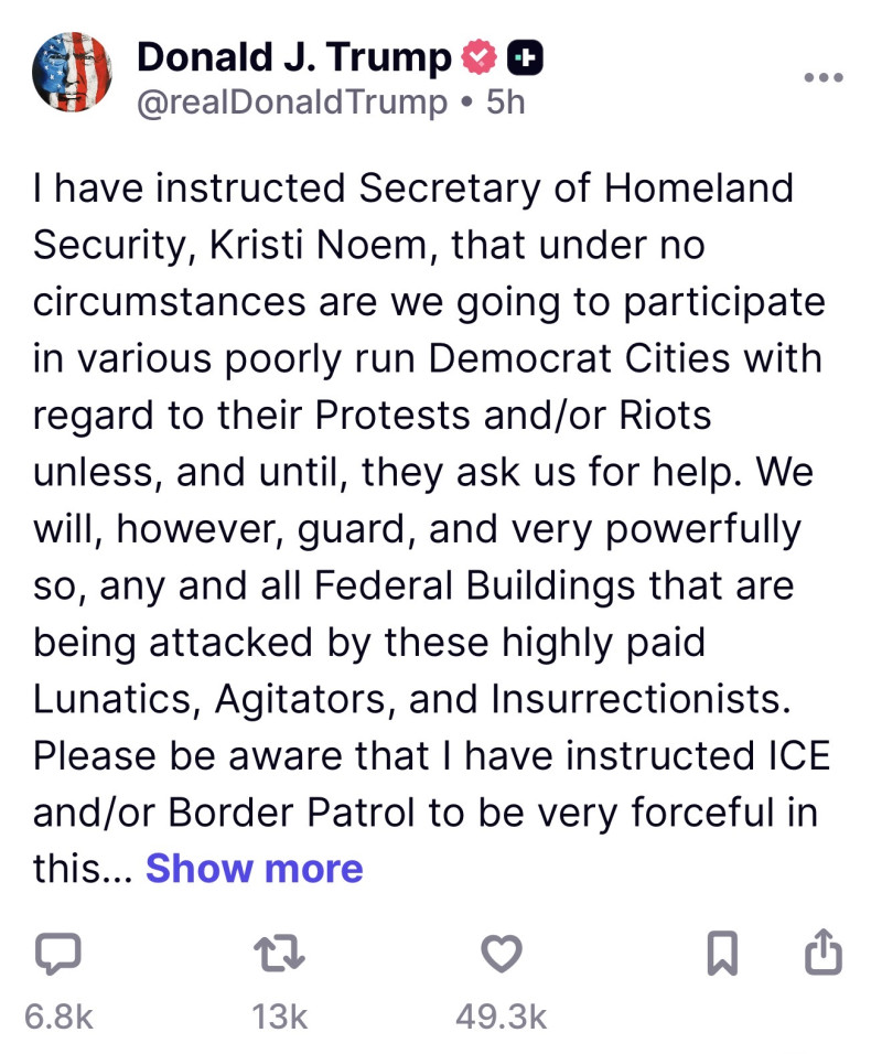 特朗普在帖文中稱,他已指示國土安全部部長克裏斯蒂·諾姆,聯邦政府“在任何情況下都不會參與管理不善的民主黨城市的抗議或騷亂”,除非這些城市“先開口請求幫助”。不過,他強調,聯邦政府將“強有力地守衛所有遭到攻擊的聯邦建築”,包括法院、政府辦公樓與公園等。