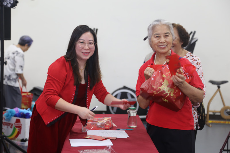 走進活動大廳,這裡喜氣洋洋,紅彤彤的春節大禮包格外搶眼。中心營運負責人 Katie 親自為每位長者發放新春禮包,長者們臉上洋溢著幸福的笑容,為整場活動增添了溫馨動人的一幕。