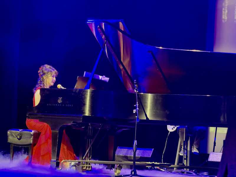 鋼琴輕聲鋪陳,《在水一方》如水波蕩漾,燈光如水般流動,舞台氛圍柔和而深情。