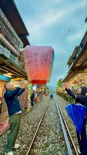 在十份放天燈時,大家寫下心願,有人認真,有人隨意,但當燈緩緩升起時,笑聲卻是一樣的輕鬆。