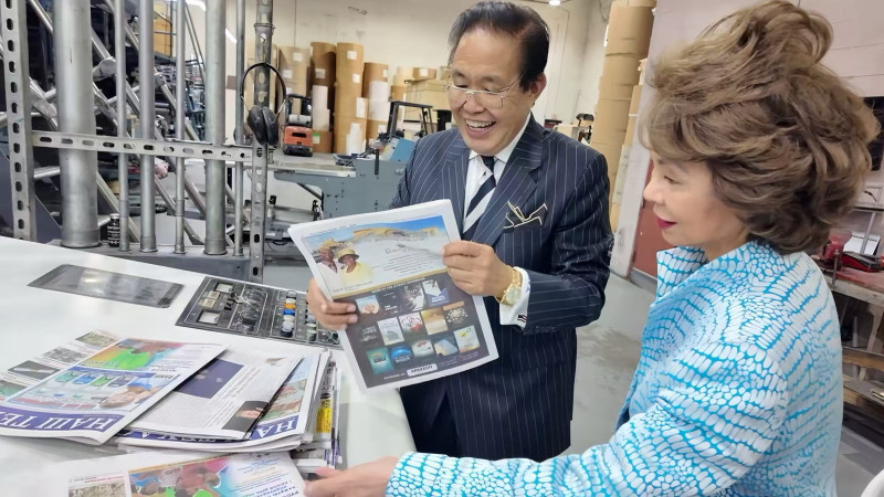 (圖爲趙小蘭在李蔚華陪同下參觀美南新聞印刷中心,了解華文媒體出版流程及社區服務工作)
