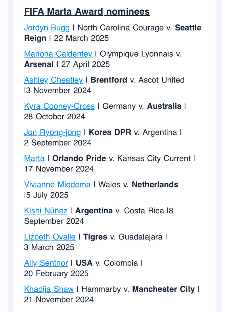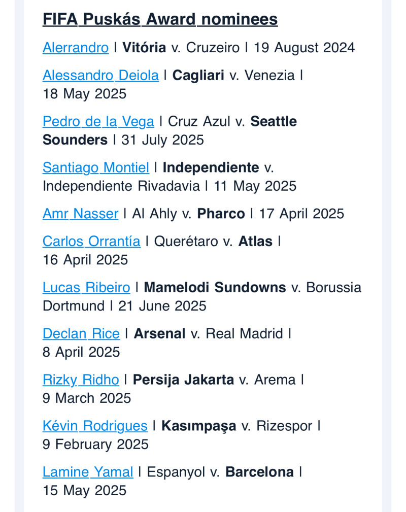 • FIFA公布玛塔奖与普斯卡什奖入围名单 2025年度最佳进球评选全面启动