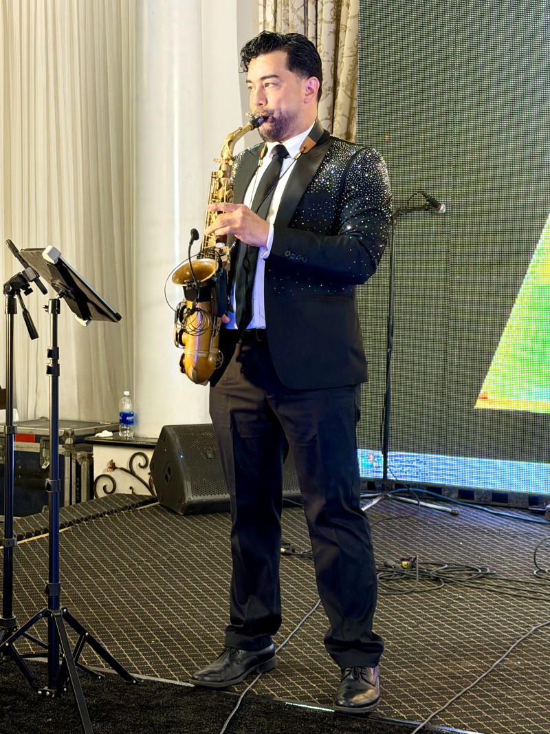 身着亮丽礼服的萨克斯演奏家率先登台,他深情的旋律如夜色流光,温柔而动人,为盛典揭开艺术的序幕。