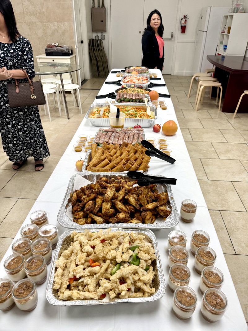 大厅内灯光柔和,音乐悠扬。长桌上陈列着丰富的亚洲美食:香脆鸡翅、鲜虾、春卷拼盘、越式烤肉、香辣鱿鱼、各式甜点与饮品应有尽有,色香味俱全。嘉宾们举杯畅谈,从行业趋势聊到个人生活,气氛温馨而热烈。