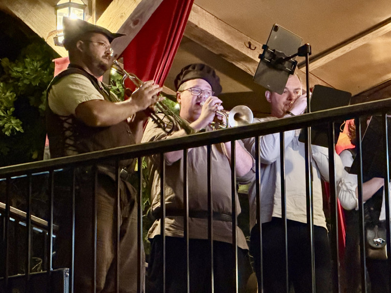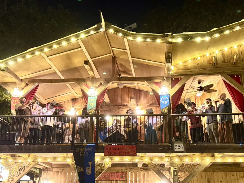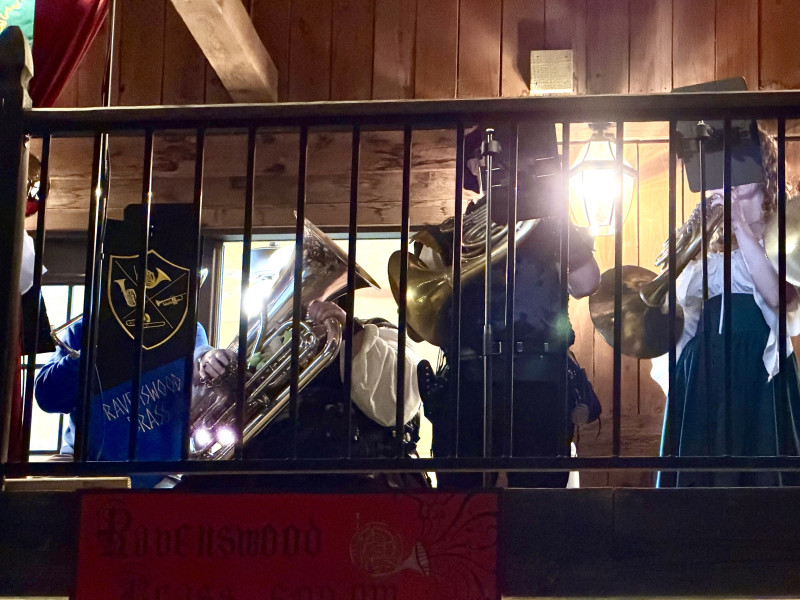夜色渐静,温柔的旋律从节庆中心飘出。那是“Ravenswood Brass”铜管乐团的夜间音乐会,金色的灯带点亮木制阁楼,乐手们身着古典服饰,在灯火中闪耀如昔日宫廷的乐师。