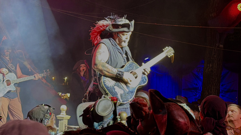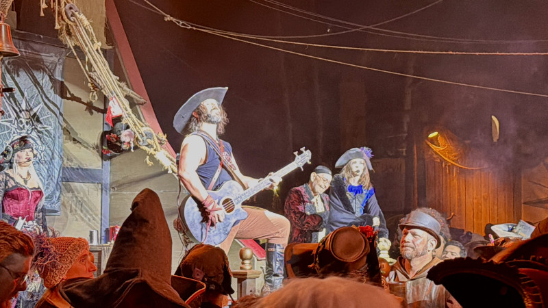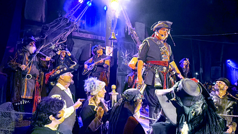 在另一隅的海盗酒馆,夜的狂欢达到了顶点。骷髅旗在风中飘扬,灯光映照着木质甲板,海盗乐队扬帆登场。鼓点如波涛,萨克斯与小提琴的旋律交织出一首海上冒险的史诗。