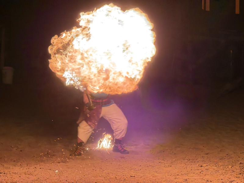 夜色更深,火焰登场。竞技场化作光与热的王国——火链翻腾,火棍旋舞,烈焰在舞者掌中生出生命的脉动。鼓声如战马奔腾,号角似天雷震响。炽烈的火光映红人群的面庞,每一个闪烁的火花都像燃烧的灵魂在歌唱。