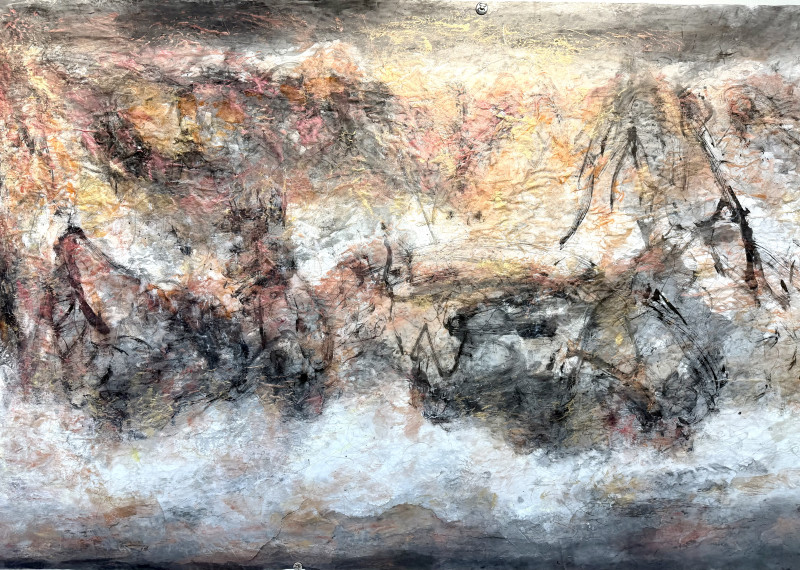 《赤壁怀古》的完成,正是一气呵成的结果。水量充沛、宣纸呼吸、墨色发韵,所有条件汇聚于同一时空之中,使画面得以“打开韵律”,让水墨自行生长。