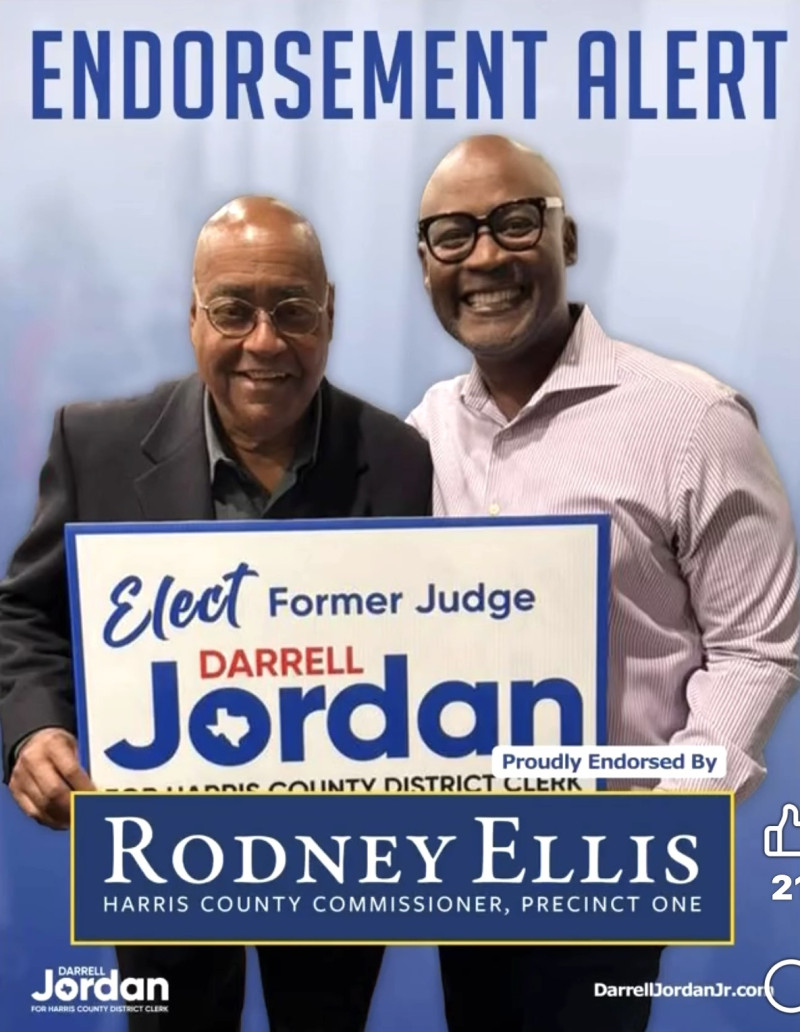 Rodney Ellis 专员在背书声明中强调,他与 Jordan 相识二十余年,深知其人格操守与公共服务精神。他说:“他在法官岗位上的8年经历,让他真正了解法院如何运作,也知道系统该如何改进。哈里斯县需要一位了解司法系统、并能让它更好服务民众的书记官,我为支持 Darrell Jordan 感到自豪。”