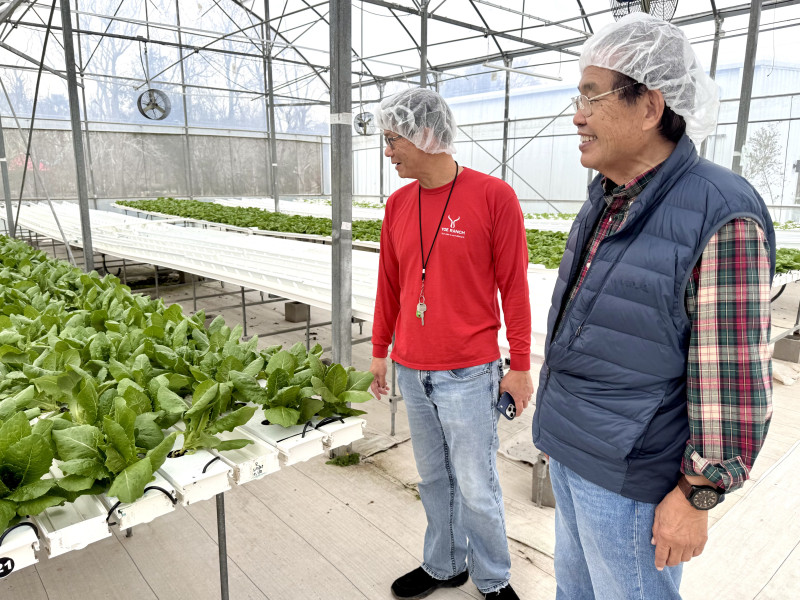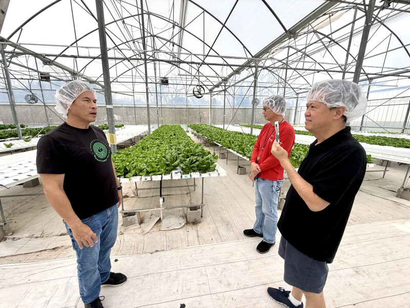 随后,李蔚华一行佩戴防护帽进入温室实地参观。温室内整齐排列的水培种植槽中,嫩绿生菜在LED补光系统与自动营养液循环装置下生长旺盛。Federico现场讲解了营养液循环原理、气候控制设备及智能监测系统的运行机制。