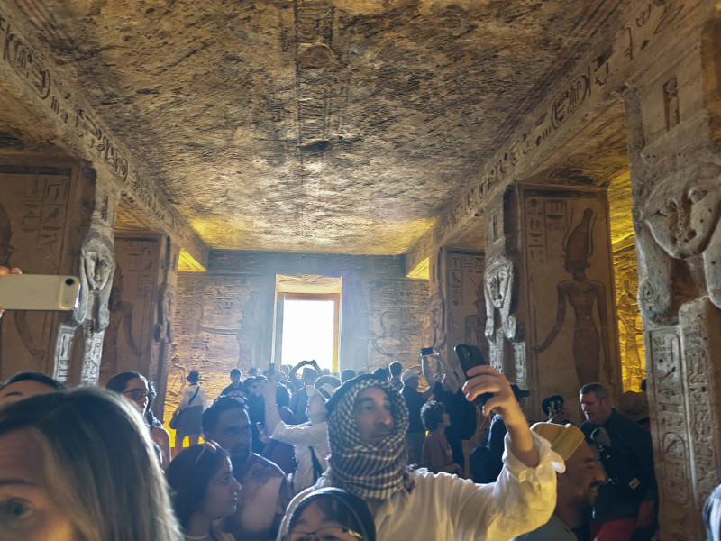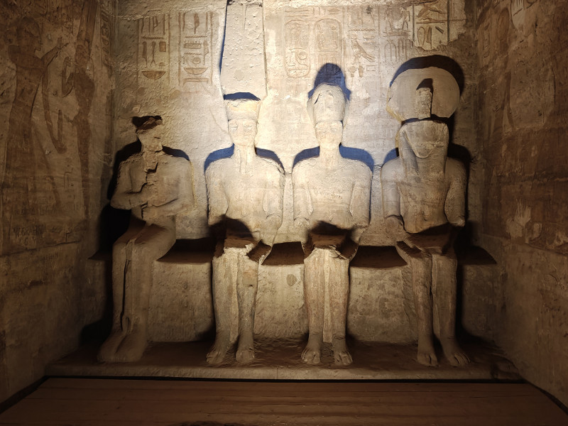 继续往里走,穿过半黑暗的大厅,神庙最深处的内殿,拉神(太阳神)、阿蒙神(看不见的力量)、拉美西斯二世(拉二)及卜塔神(黑暗之神)四尊神像并排静坐,年復一年等待着2月22日和10月22日的清晨,届时阳光会穿过60多公尺长的神庙走廊,準确地照亮到前三尊神像,只有卜塔神永远在阴影中。原来,神庙不只是建筑,也是被同时刻进石头里的时间、信仰与天文。