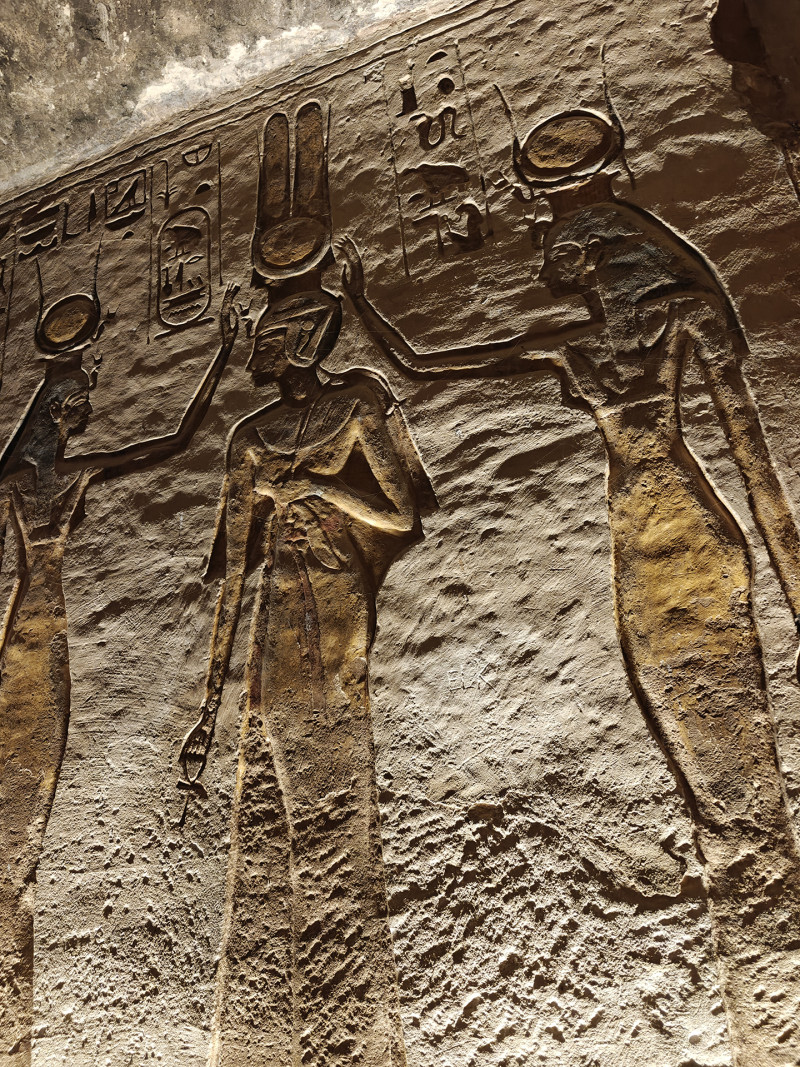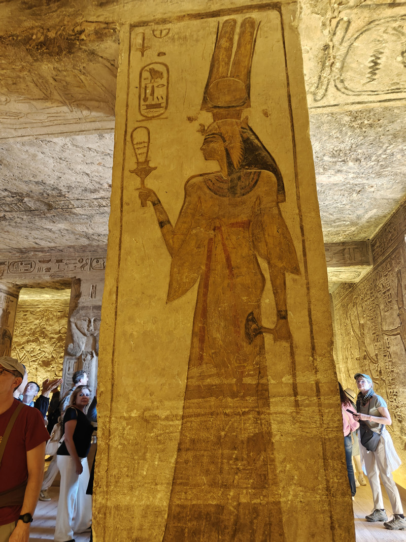 烈日下随着长长的队伍挤进殿内,墙上的浮雕,不再只是战争与征服,还有音乐、祭祀,以及人与神之间更温馨的连结。哈索尔象爱与欢乐,整座神庙也充满温和的气息。是的,古埃及人留下的,不只有力量的表现,也有他们认真爱过的证据。