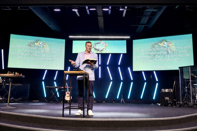 礼拜在恢弘而富有现代感的舞台氛围中拉开帷幕。多组灯光纵横交错,背景屏幕呈现复活节主题画面,现场乐队整齐亮相——主唱、和声、吉他、键盘与鼓手默契配合,营造出既庄严又充满活力的敬拜空间。